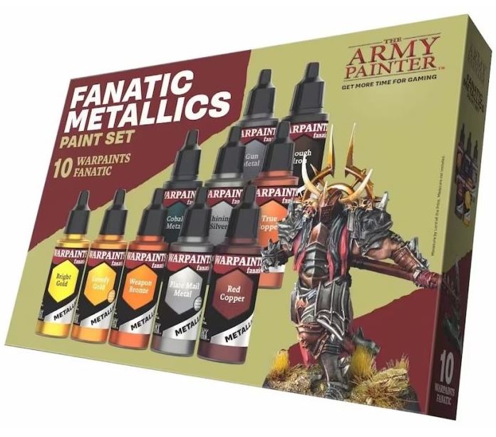 The Army Painter taking preorders for a set of Metallics from their new Fanatic paint line – Last time The Army Painter rolled out a new paint range it was… bad. It was mishandled, and then complaints were downplayed. The Speedpaints were just bad. That said, I’ve picked up a few of the Speedpaints 2.0 range and I like them a lot. It’s the metallics I use, and I really like them. Among the releases for this new range, there’s a box of metallics: