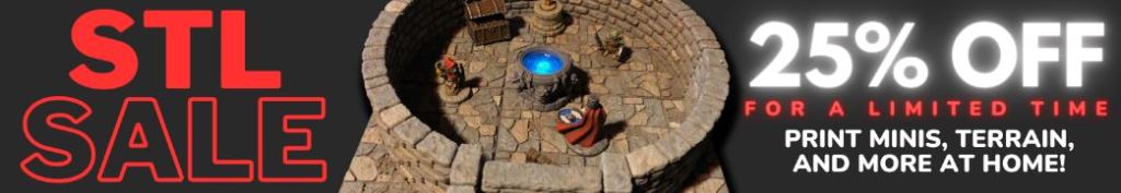 DriveThruRPG running an STL sale – I’m not going to pretend that DriveThruRPG is the first place I go for STLs. That tends to be either Patreon or MyMiniFactory. They do have some good stuff, though. I’ve previously picked up some Star Trek files. Now, they’re running a sale:
