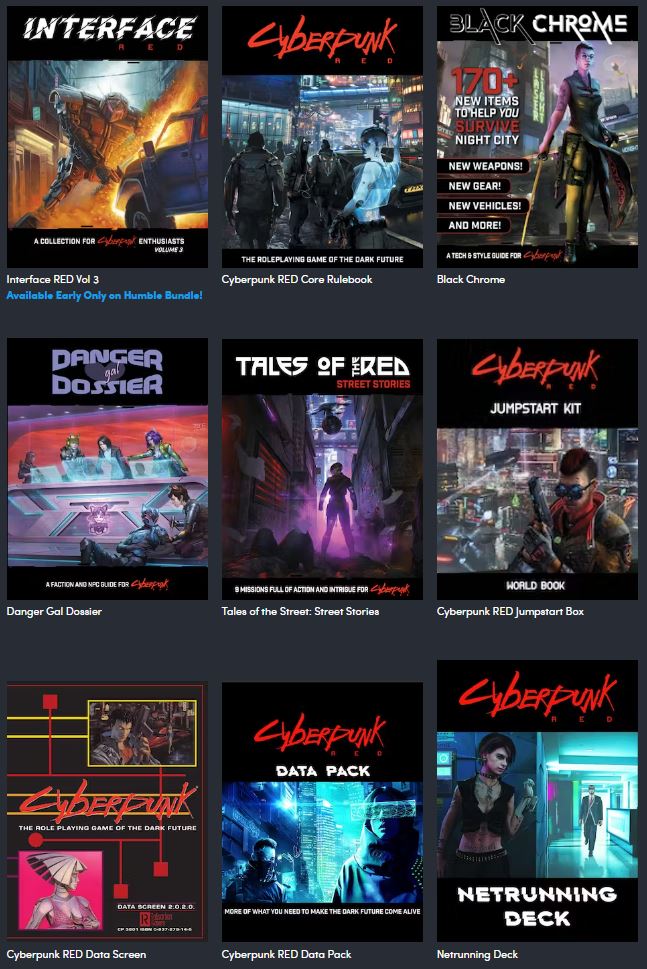 ‘Humble Bundle currently has a Cyberpunk bundle on the go. Its got a mix of the newer Cyberpunk Red materials, and some books from the classic Cyberpunk 2020 line. ’Humble Bundle currently has a Cyberpunk bundle on the go. It’s got a mix of the newer Cyberpunk Red materials, and some books from the classic Cyberpunk 2020 line.