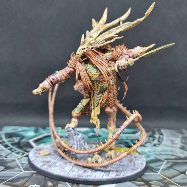 He was quite fun to paint. The colours are, for me, quite muted. I stuck with the yellow and green. I stuck with the fur colour and the skin. I stuck with the bronze. For the knives, I used the greenish metal of The Army Painter’s Aztec Gold Speedpaint.