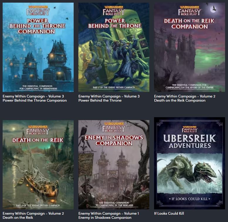 The main attraction here, beyond the core book, is the Enemy Within campaign. This is a truly epic campaign that spans volumes, plus companion books, which are also included in this bundle. The sheer amount of content here, and the scope of the campaign, is pretty staggering. I love that players can really have an impact on the world as they progress through this revised edition of the classic WFRP campaign.