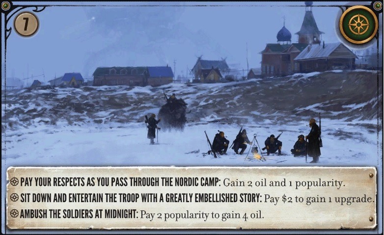 The group I mostly play with are all also fans of roleplaying games, so we really like when these encounters come up. First, the art is gorgeous. Second, the card doesn’t spell out a scenario in detail. It instead gives a picture and offers some options for your action. I love this, because it means you can tell your own wee story. Generally, the encounters have ‘peaceful’, ‘neutral’, and ‘aggressive’ options. It’s really cool and is a nice narrative touch that also lets you tailor the bonus you recieve to what you actually need in that moment. This is such a small part of the game, but it’s a great example of the attention to detail that’s been put in, as this mechanism didn’t need to be this cool.