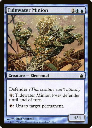 You need both on the board, and Tidewater Minion cannot be suffering from summoning sickness. We need to tap him! When we do tap him, we are targeting himself with his second ability. This taps him and resolves the looting effect on Unctus. We then resolve the untap ability on Tidewater Minion.