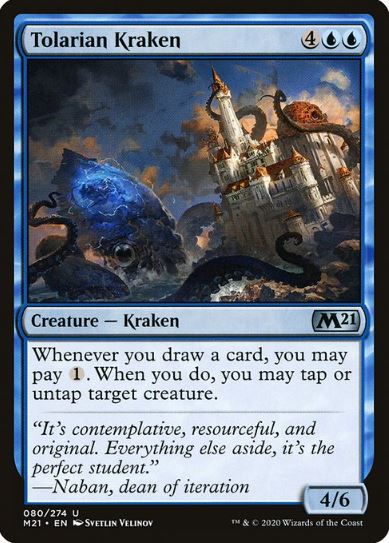 Let’s start by tapping your mana-producing blue creature to get a mana. This triggers Unctus and allows you to draw and then discard a card. Use this mana to pay for Tolarian Kraken’s ability and untap your mana-producing blue creature. At this point, you may tap him again for another mana and start another cycle. Do this as many times as you want, looting until you get something useful.