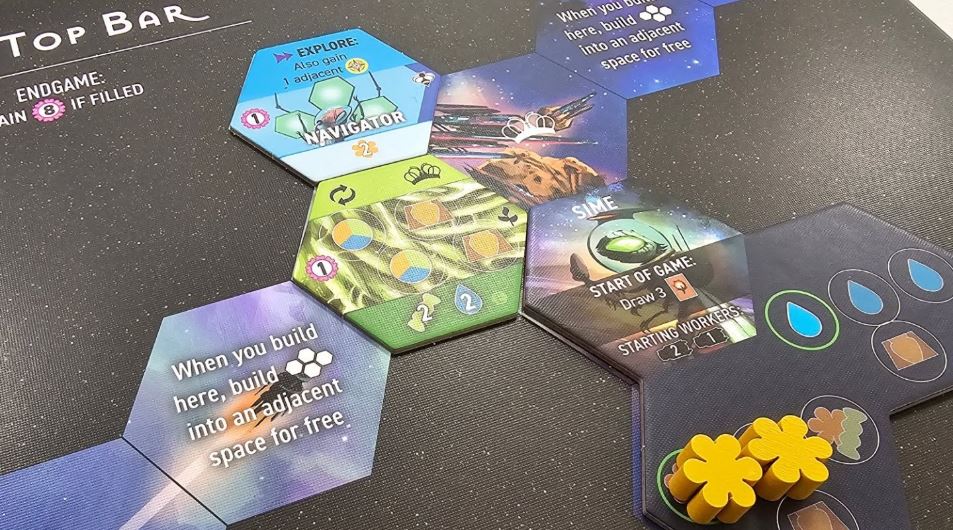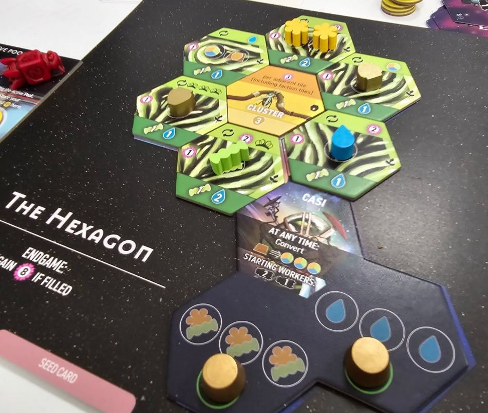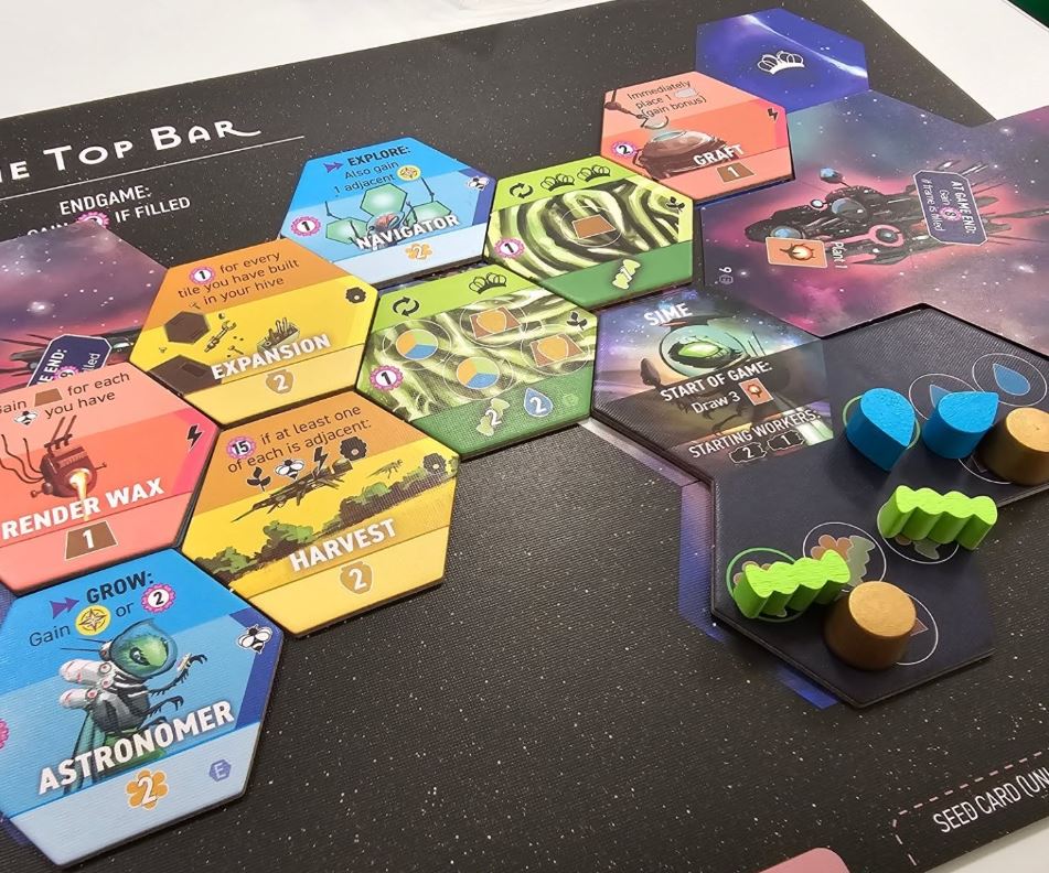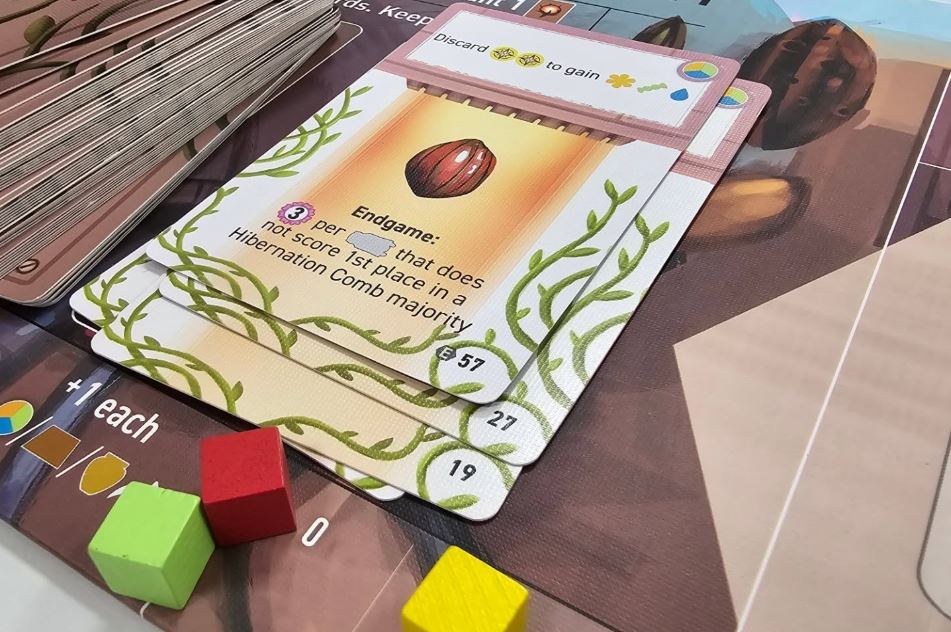 One of the standout features of Expanding the Hive, and the one that our group found most refreshing, is the new frames. These are the multi-tile blocks that let you add more buildable space to your hive. Unlike the base game frames, these offer a real range of different building bonuses while still awarding 8 points for filling them completely. This makes them far more interesting than the old frames, which all gave you access to more seed cards. Having more variety is really good; it’s great that not all frames are the same any more. The expansion also includes balance improvements, such as splitting the frames into two stacks for drafting and tweaking explore tokens. On explore tokens, there are more cards and tiles that now interact with explore tokens. I love this. I love that they’ve taken something already in the game and just brought it a little more prominence and utility.