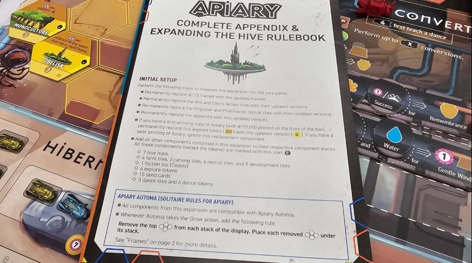 Let’s start with what’s in the box. The expansion introduces 15 new frames, 7 hive mats, 4 farms, 3 carvings, 4 recruits, 5 developments, and 3 new dance tiles with 6 new tokens. There are also 15 new seed cards and 4 explore tokens. Additionally, there’s a new faction, the Cedoni, and updated versions of 2 existing faction tiles. These components seamlessly integrate into the base game, offering fresh strategies and more viable, diverse paths to victory.