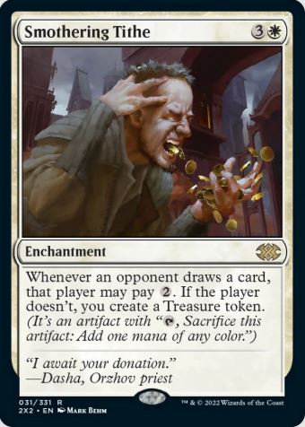 At its core, Smothering Tithe is a simple yet devastatingly effective enchantment. Whenever an opponent draws a card, they must pay 2 mana, or you create a Treasure token. As a reminder, treasure tokens are artifact tokens that can be tapped and sacrificed to give a single mana of any colour. Given that card draw is a fundamental part of Magic, this ability ensures a steady influx of mana for the controller.