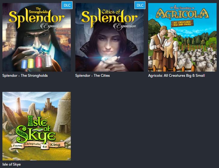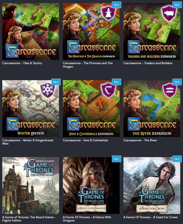 - Carcassonne (+5 DLCs): Build medieval landscapes and outmaneuver opponents in this tile-laying classic.