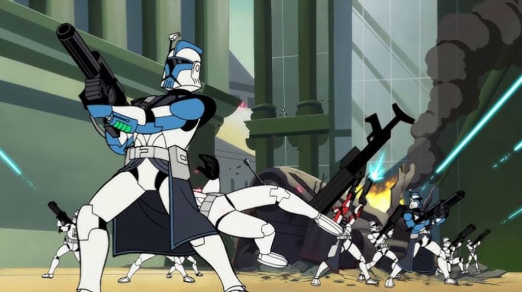 And then there’s General Grievous. Introduced here as a terrifying force of nature, he’s a far cry from the wheezing villain of Revenge of the Sith. His debut is pure, beautiful horror: stalking Jedi in the mist, crushing them with mechanical precision. He’s then shown as an absolute powerhouse later in the series, when he returns to capture the chancellor. Watching him just dismantle a unit of clone troopers is as mesmerising as it is terrifying. This series made Grievous a legend before the film even rolled.