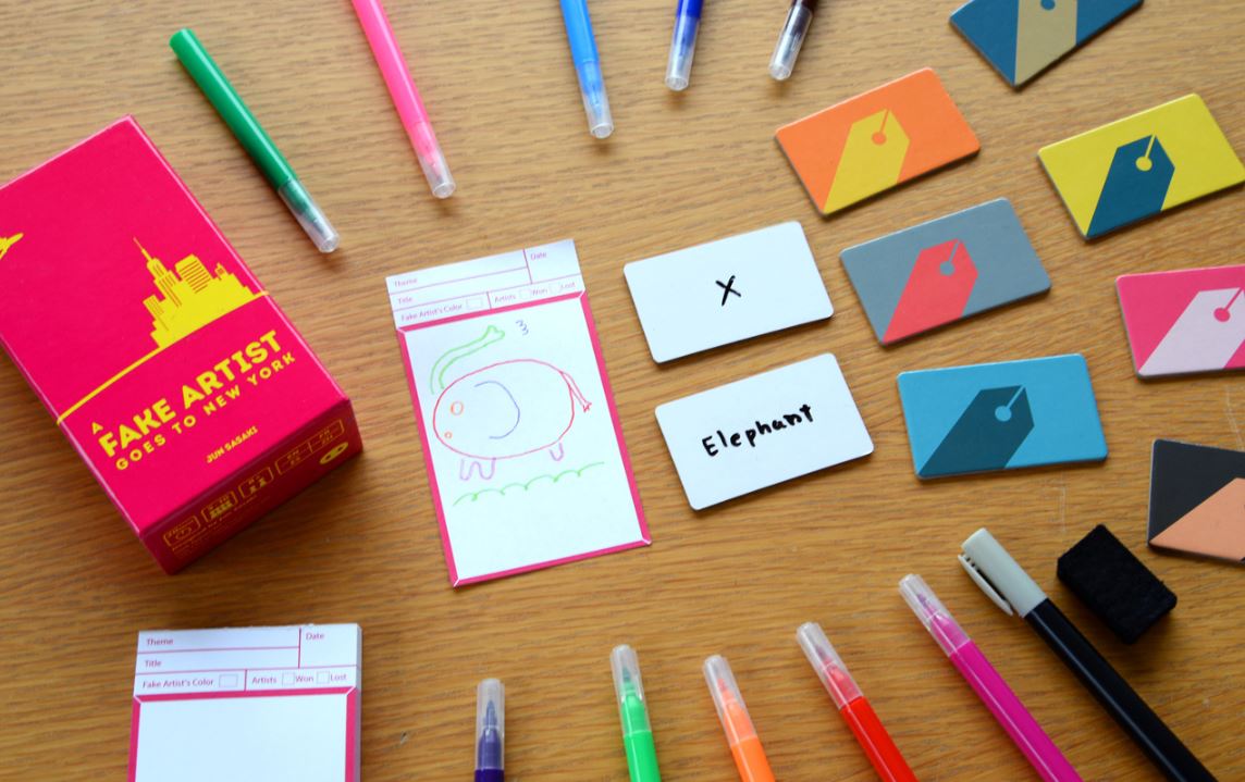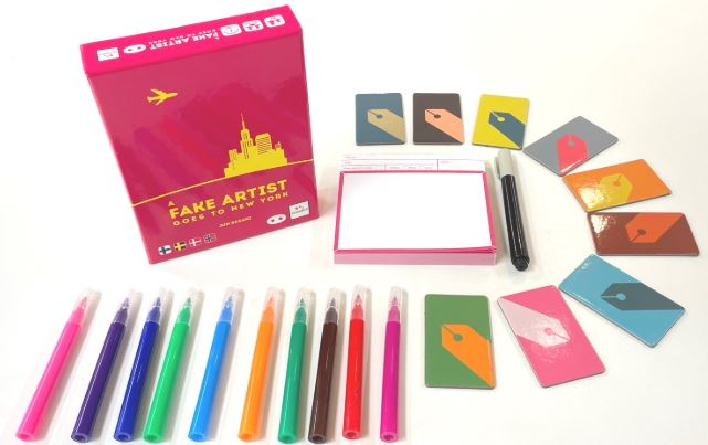 A Fake Artist Goes to New York is our Game of the Month for August 2025. The game was designed by Jun Sasaki and published by Oink Games, publishers of a previous game of the month, Scout. It is a social deduction party game that sees players drawing a collaborative image based on a prompt. This is done one line at a time, as players pass the paper around until each player has taken two turns with the uniquely-coloured pen. The thing is, one player does not know what the group is trying to draw, and must hide this fact. They win if they are not caught. They also win if they are caught, but can, in response, guess the prompt word. This means that players need to be subtle and not too obvious in their drawing. They need to show just enough to signal to the others that they know the prompt, but not enough to make the prompt explicit to the fake artist.
