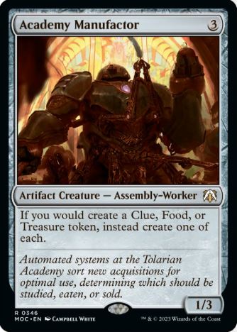 Next we need token creation, we need to multiply like rabbits…. literally. Now initially I made the mistake of leaning into creature tokens before really understanding how good Cadira was, meaning I’d just get board wiped and have to start all over again. I decided to move to more treasure and food creation on top of my standard tokens as these unlocked more resources to use and ultimately were safer than creatures. It’s very unlikely that food and treasures will be targeted and when I hold on to them, even when board wipes happen to my creatures, I have a quick way to build back up almost immediately. Having 10 food on standby means I already have 10 rabbits on Cadira’s first swing. To get tokens quickly I added a lot of staple cards like ‘Academy Manufactor’, ‘Tireless Provisioner’ and ‘Second Harvest’ which quickly help build up token pools fast and allow me to double/triple the value of my other creators. A key piece I’ve recently added is ‘Primal Vigor’ which is an incredible hit for me to boost token duplication and when the rarer buff pieces kick in +1/+1 counters.