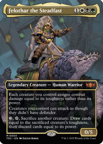 - Toughness as Offence: Felothar converts raw toughness into offensive power. A 0/5 or 0/6 creature becomes a substantial attacker without needing power printed on the card, which flips many “walls” into threats and turns conventional combat math on its head.