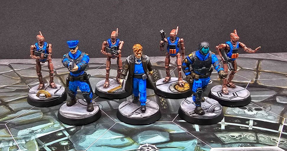 I then moved on to my main project for the month, which was preparing a bunch of miniatures for some cyberpunk-themed skirmish games. First up, Police Squad: