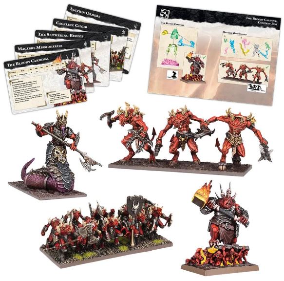 Mantic releases The Bloody Cardinal Company Box for KoW Champions – The Bloody Cardinal Company Box brings a full Abyssal warband to life with a mix of dynamic hard‑plastic infantry and a showstopping MasterCraft resin character. From the hulking Bloody Cardinal himself to the snarling Lower Abyssals, Berserkers, and the towering Nagarri, every sculpt leans into exaggerated anatomy, jagged armour, and flame‑licked menace — a striking set that paints up beautifully and dominates the table..